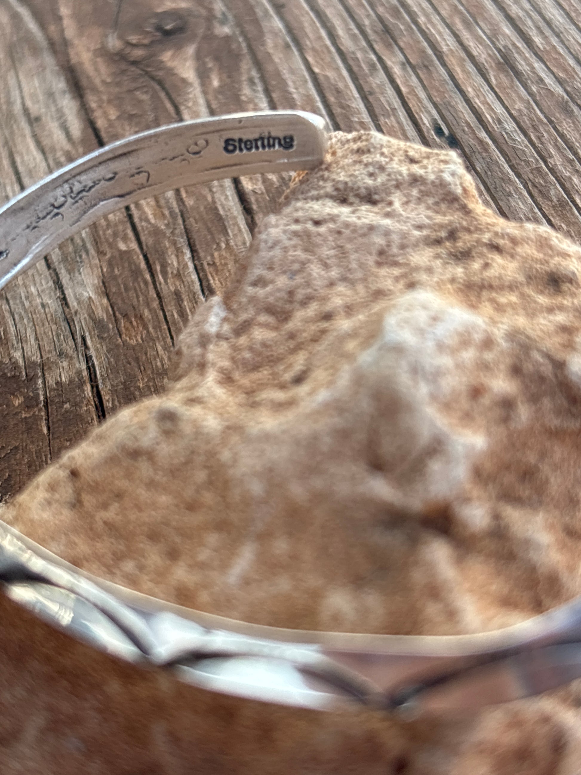 Sterling Silver cuff with stamping on sides of the silver cuff. Stamping may vary.