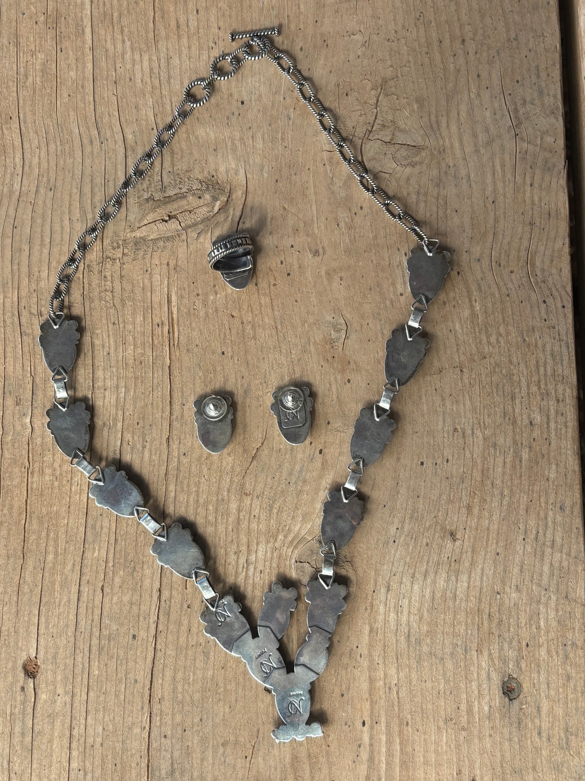 Calvin Nelson Turquoise & Spiny Oyster Prickly Pear Blossom Necklace, Ring and Post Earring Set C1