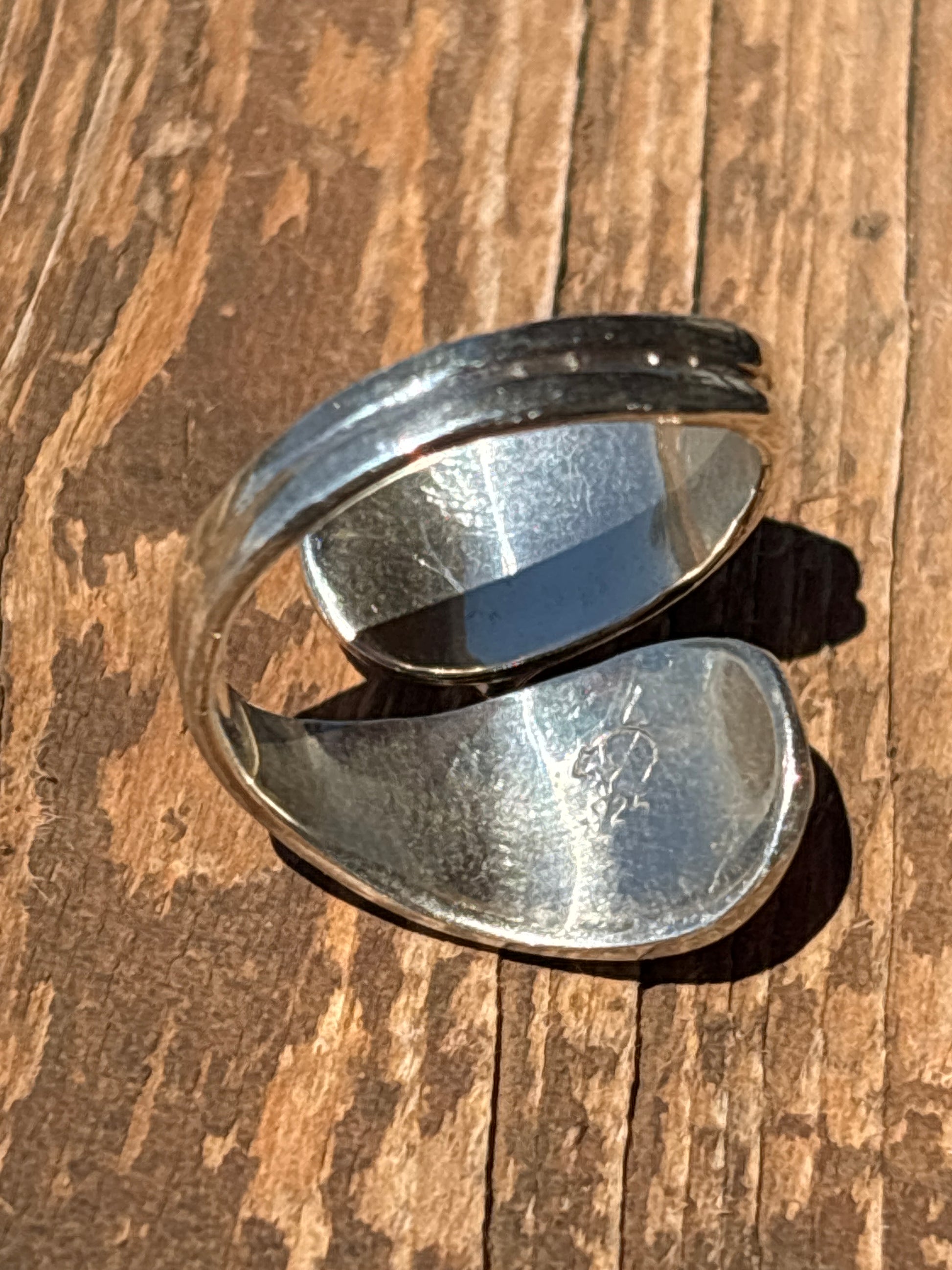 Beautiful wrap ring with each side framed by red oval and silver leaves.